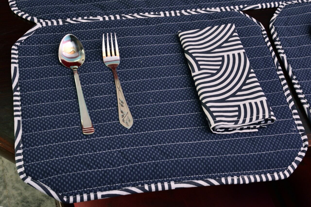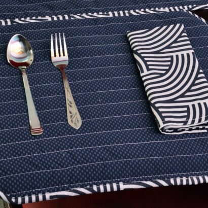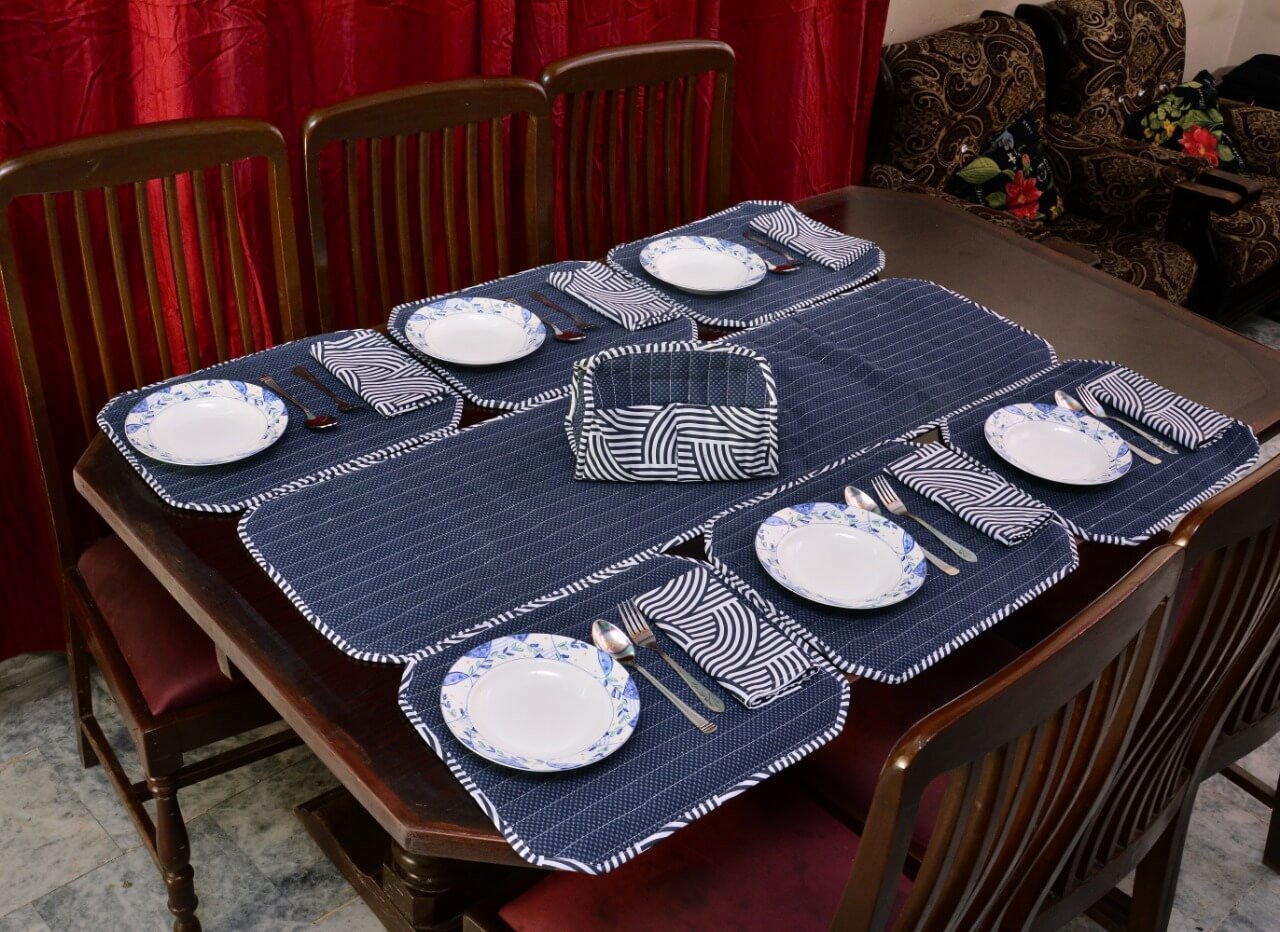 Be the first to review “Elegant Navy Blue Stripe Dining Table Mat Set – 6 Seater with Matching Napkins & Basket”
