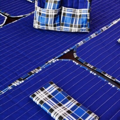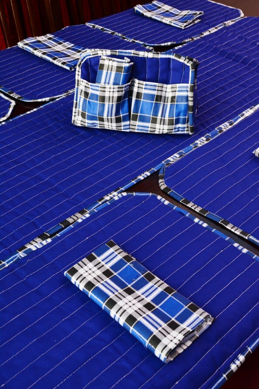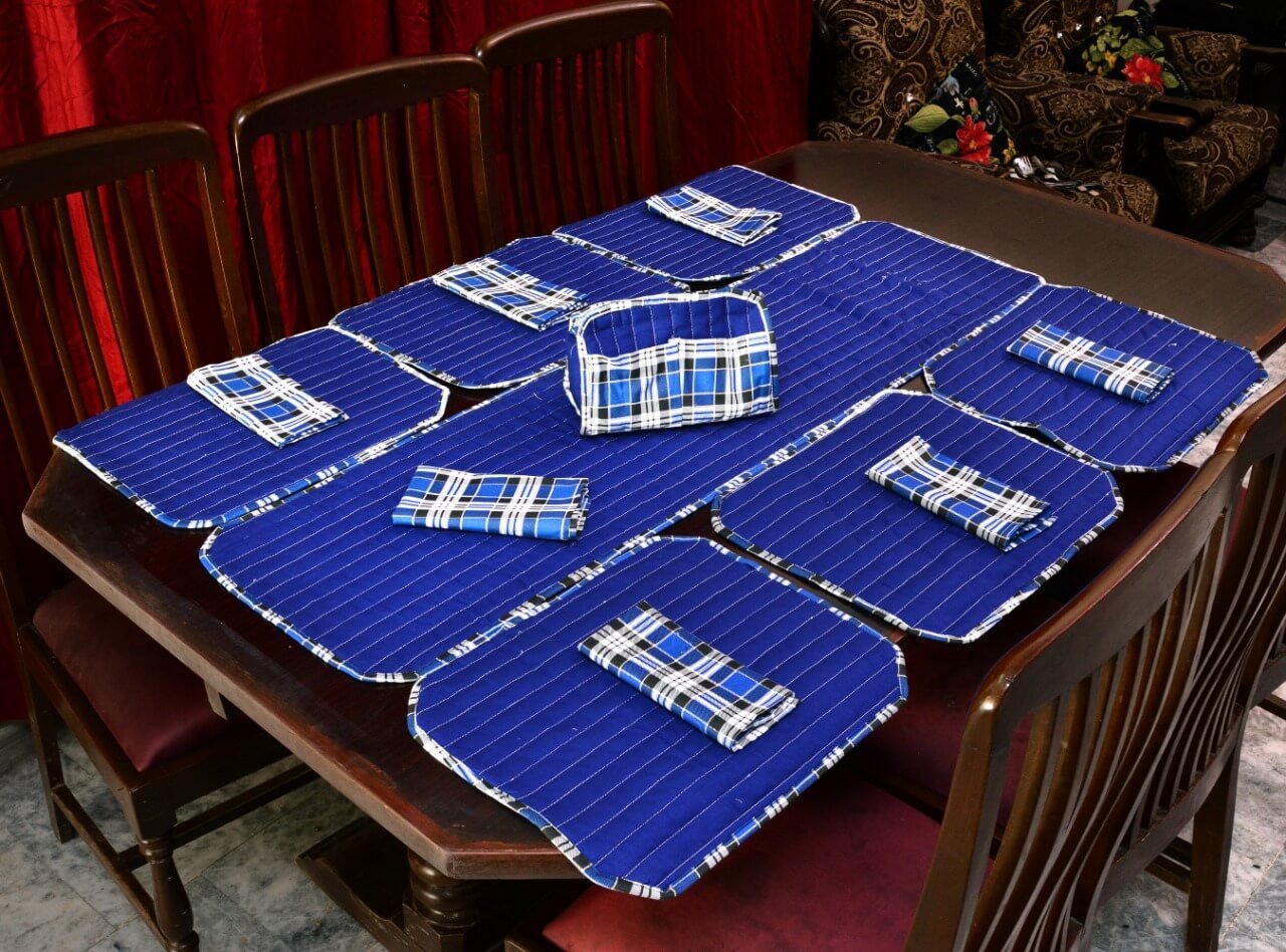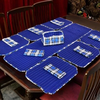 Be the first to review “Elegant Royal Blue Stripe Dining Table Mat Set – 6 Seater with Matching Napkins & Basket”